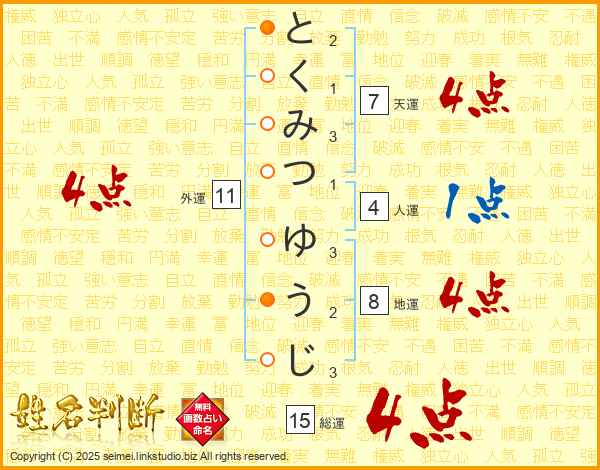 画数の奇数(○陽)と偶数(●陰)の配列で吉凶を占います。どちらかにかたよる名前は大凶名で避ける必要があります。画数の奇数偶数。