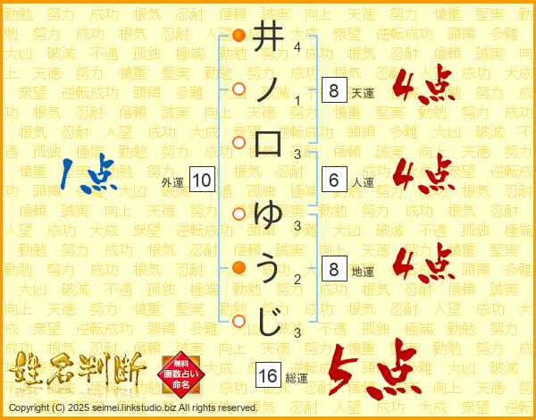 生活面を象徴する運勢です。外部から受ける影響力を表し、結婚運、家庭運や職場、環境への順応性を表します。総運から人運を引いた画数。姓や名が1文字の場合を除く。