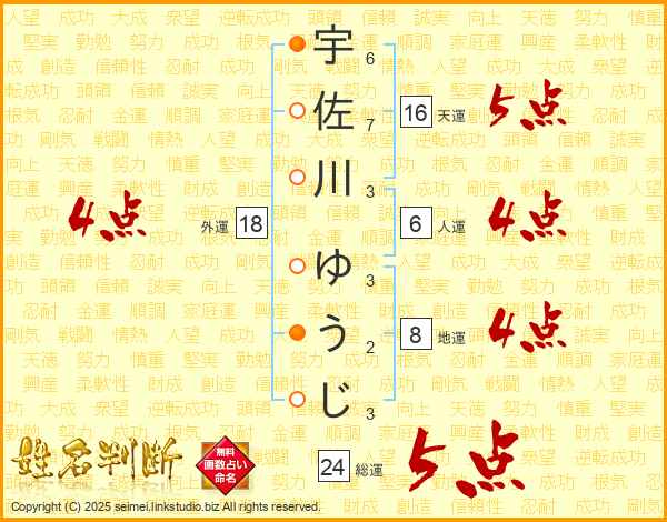 宇(6画)佐(7画)川(3画) ゆ(3画)う(2画)じ(3画)