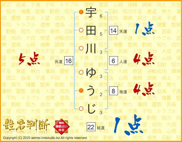 宇(6画)田(5画)川(3画) ゆ(3画)う(2画)じ(3画)