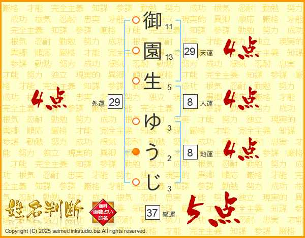 御(11画)園(13画)生(5画) ゆ(3画)う(2画)じ(3画)