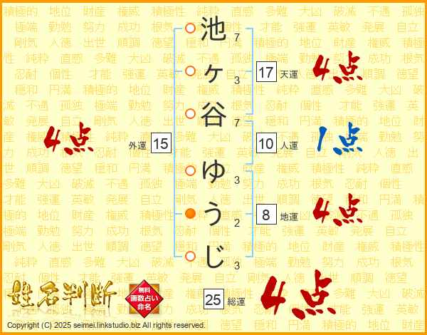 池ヶ谷ゆうじさんの総運は25画の4点!