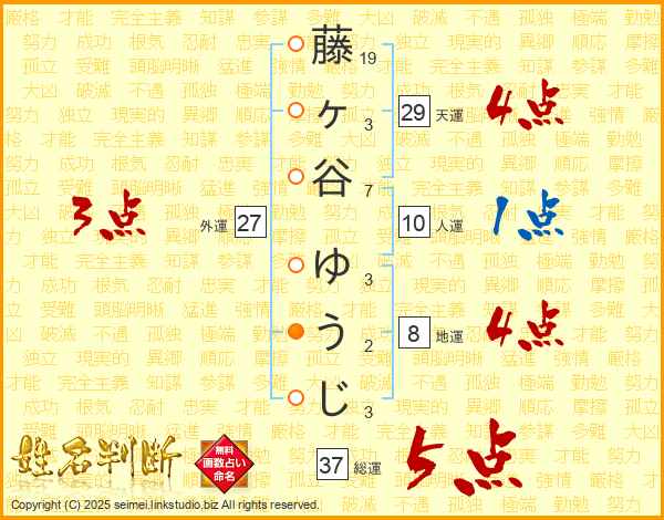 藤ヶ谷ゆうじさんの総運は37画の5点!
