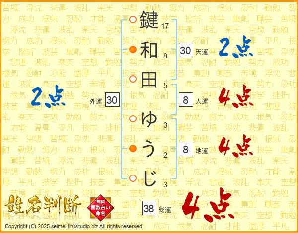 鍵(17画)和(8画)田(5画) ゆ(3画)う(2画)じ(3画)