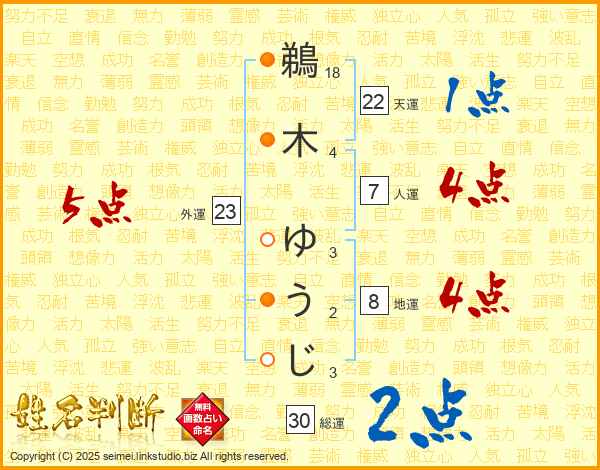 鵜(18画)木(4画) ゆ(3画)う(2画)じ(3画)
