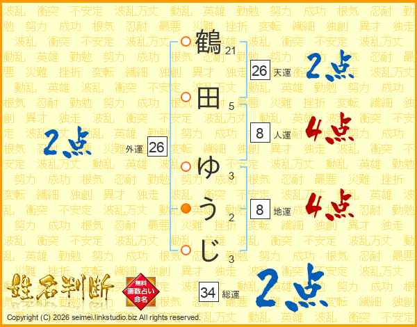 鶴(21画)田(5画) ゆ(3画)う(2画)じ(3画)