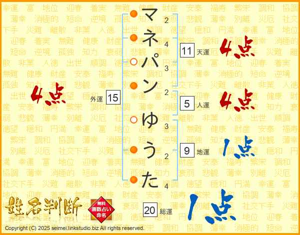 マ(2画)ネ(4画)パ(3画)ン(2画) ゆ(3画)う(2画)た(4画)