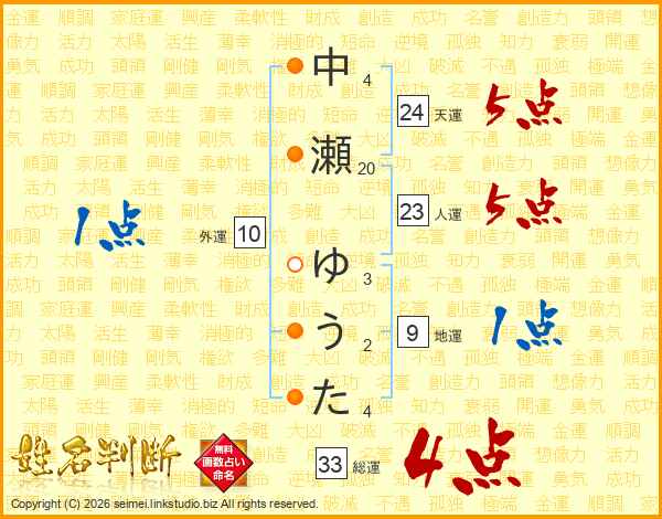 中瀬ゆうたさんの総運は33画の4点!