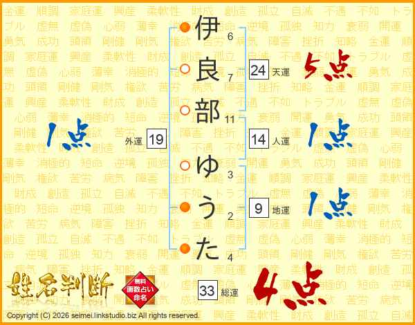 伊良部ゆうたさんの総運は33画の4点!