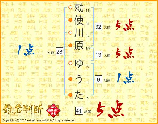 勅(11画)使(8画)川(3画)原(10画) ゆ(3画)う(2画)た(4画)