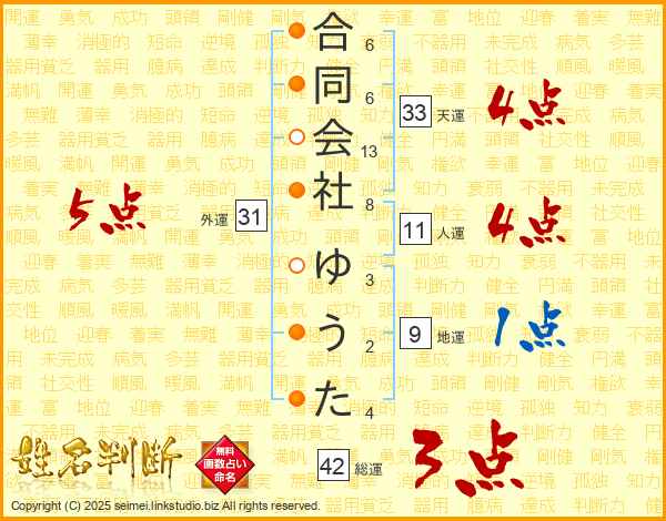合(6画)同(6画)会(13画)社(8画) ゆ(3画)う(2画)た(4画)