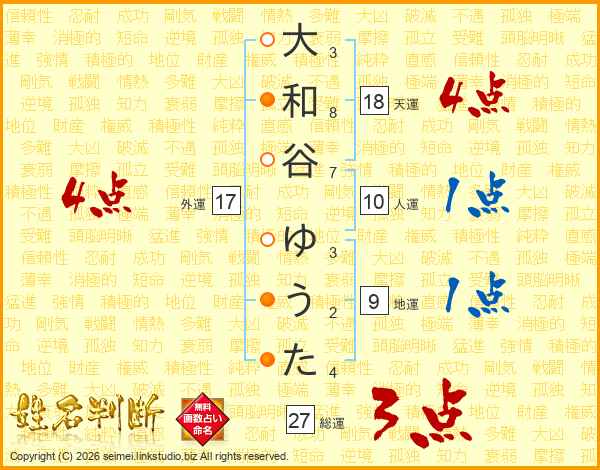 大(3画)和(8画)谷(7画) ゆ(3画)う(2画)た(4画)