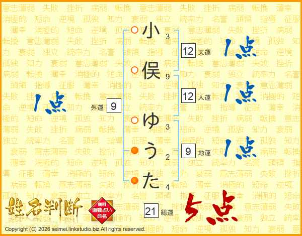 小(3画)俣(9画) ゆ(3画)う(2画)た(4画)