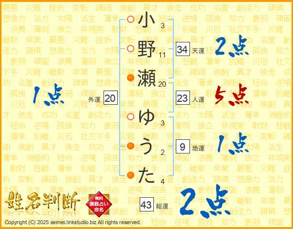 小野瀬ゆうたさんの総運は43画の2点!
