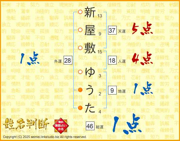 新(13画)屋(9画)敷(15画) ゆ(3画)う(2画)た(4画)