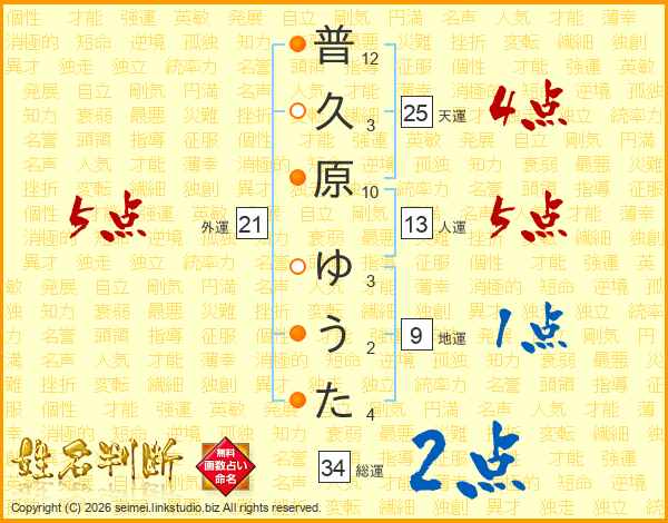 普(12画)久(3画)原(10画) ゆ(3画)う(2画)た(4画)