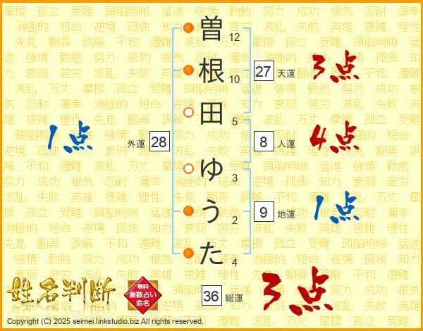 曽(12画)根(10画)田(5画) ゆ(3画)う(2画)た(4画)