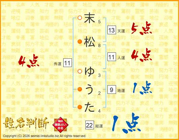 末松ゆうたさんの総運は22画の1点!