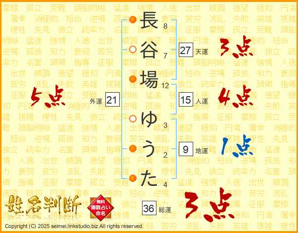 長(8画)谷(7画)場(12画) ゆ(3画)う(2画)た(4画)