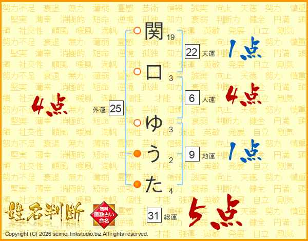 関口ゆうたさんの総運は31画の5点!