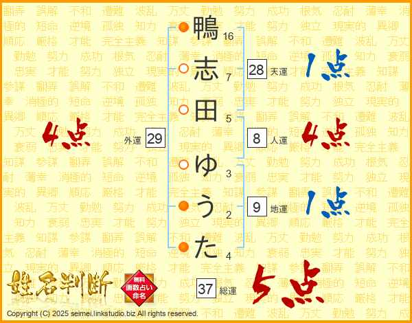 鴨(16画)志(7画)田(5画) ゆ(3画)う(2画)た(4画)