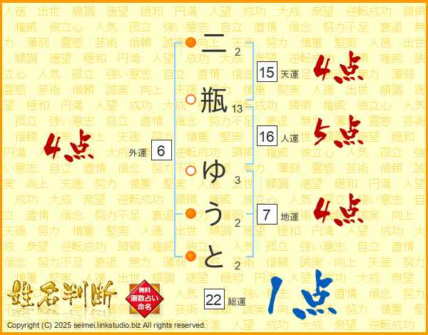 家系が持つ宿命的な運勢を表します。祖先から受け継いだ苗字ですので自分の力が及びません。家柄を象徴します。苗字の合計画数。