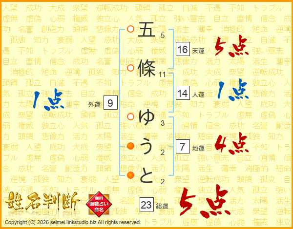 五條ゆうとさんの総運は23画の5点!