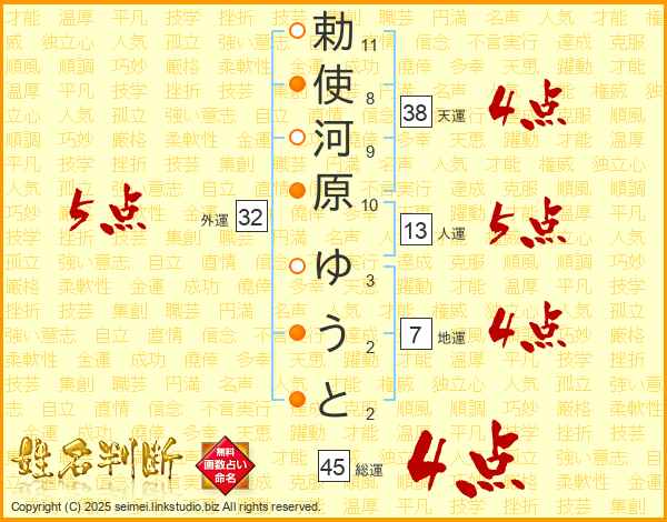 勅(11画)使(8画)河(9画)原(10画) ゆ(3画)う(2画)と(2画)