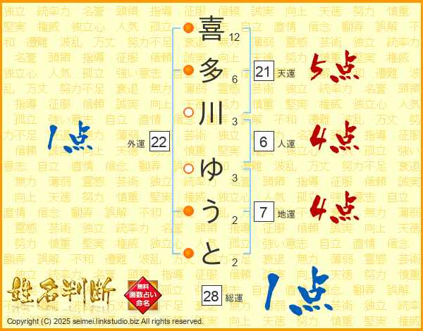 喜(12画)多(6画)川(3画) ゆ(3画)う(2画)と(2画)