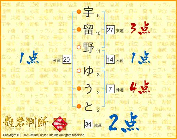 宇(6画)留(10画)野(11画) ゆ(3画)う(2画)と(2画)