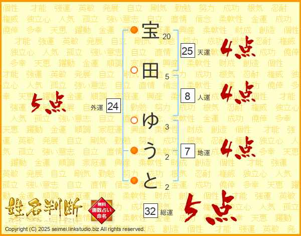 宝(20画)田(5画) ゆ(3画)う(2画)と(2画)