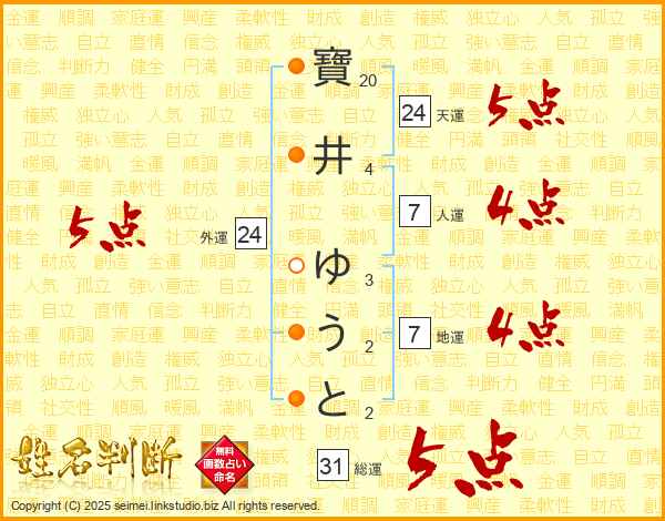 寶(20画)井(4画) ゆ(3画)う(2画)と(2画)