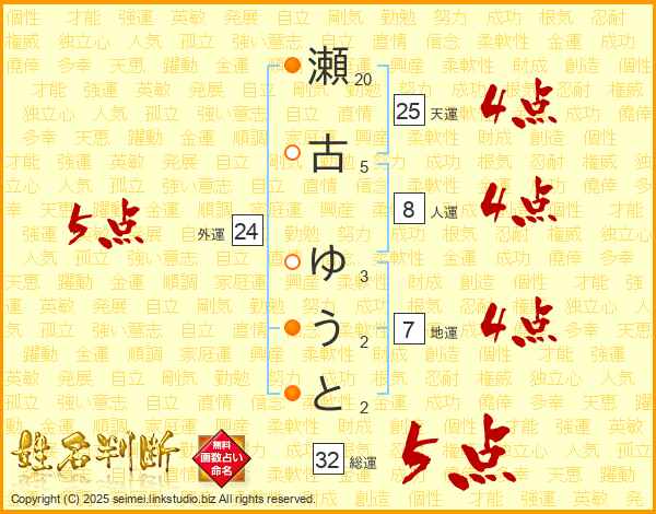 瀬(20画)古(5画) ゆ(3画)う(2画)と(2画)