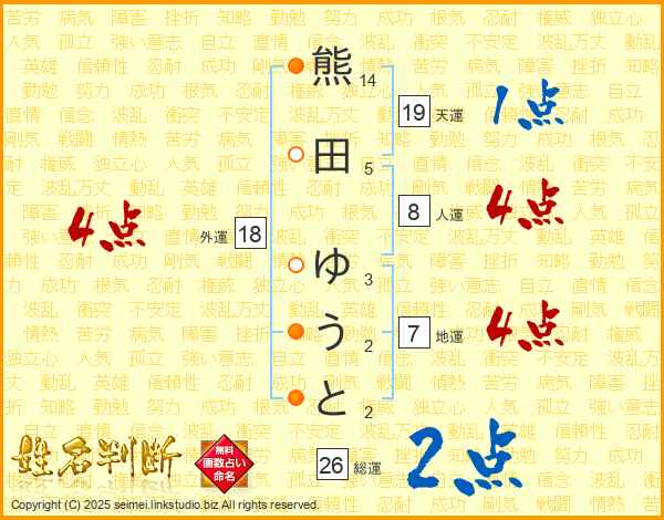 熊田ゆうとさんの総運は26画の2点!