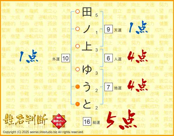 田(5画)ノ(1画)上(3画) ゆ(3画)う(2画)と(2画)