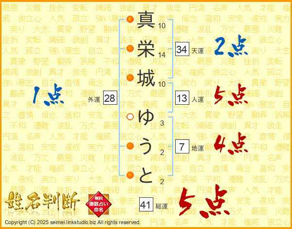 あなたの人生を表す1番重要な運勢です。生涯を通じて影響する総合運となり、主に50歳以降の晩年期に影響を及ぼします。苗字と名前の合計画数。