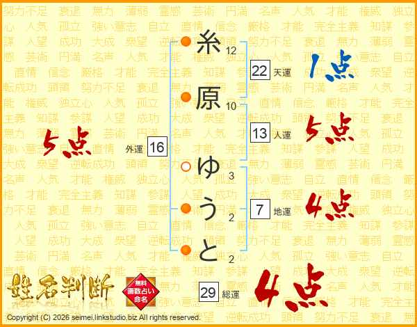 糸原ゆうとさんの総運は29画の4点!