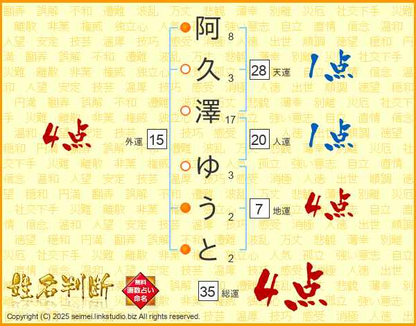 阿(8画)久(3画)澤(17画) ゆ(3画)う(2画)と(2画)