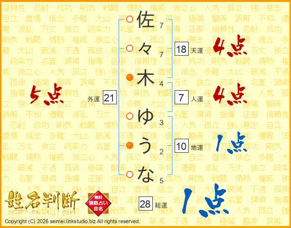 佐(7画)々(7画)木(4画) ゆ(3画)う(2画)な(5画)
