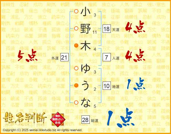 生活面を象徴する運勢です。外部から受ける影響力を表し、結婚運、家庭運や職場、環境への順応性を表します。総運から人運を引いた画数。姓や名が1文字の場合を除く。