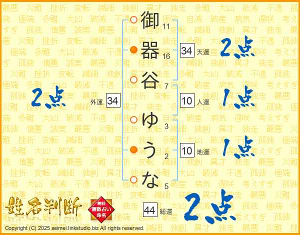 御(11画)器(16画)谷(7画) ゆ(3画)う(2画)な(5画)
