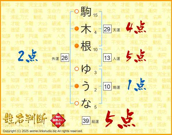 駒(15画)木(4画)根(10画) ゆ(3画)う(2画)な(5画)