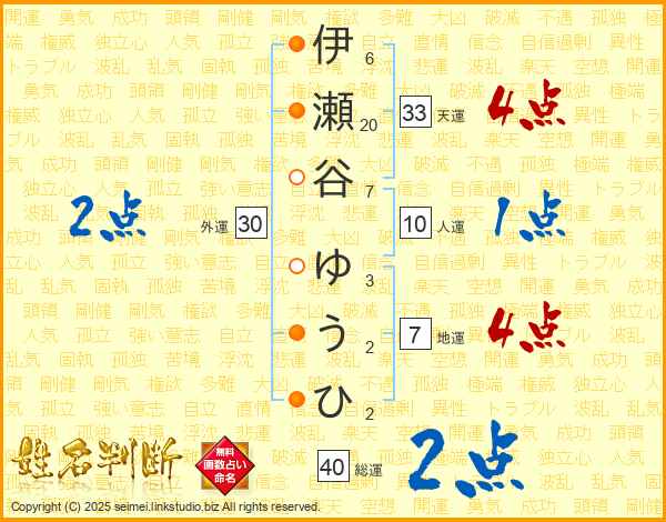 伊瀬谷ゆうひさんの総運は40画の2点!