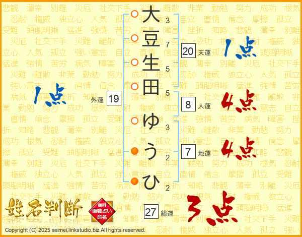 大(3画)豆(7画)生(5画)田(5画) ゆ(3画)う(2画)ひ(2画)
