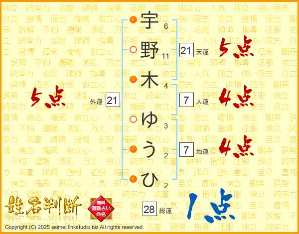 宇野木ゆうひさんの総運は28画の1点!