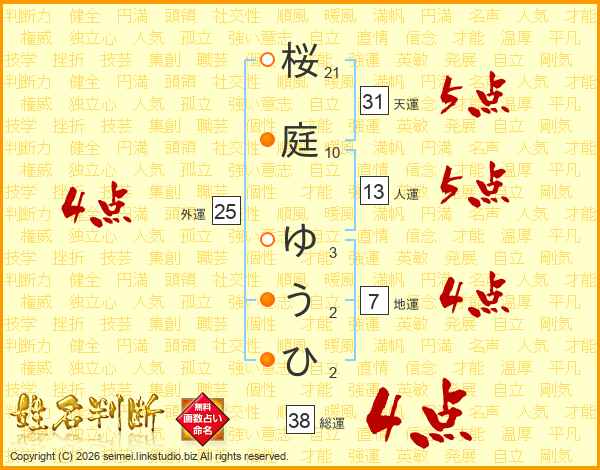 桜庭ゆうひさんの総運は38画の4点!