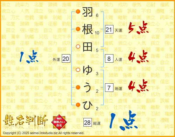 羽(6画)根(10画)田(5画) ゆ(3画)う(2画)ひ(2画)