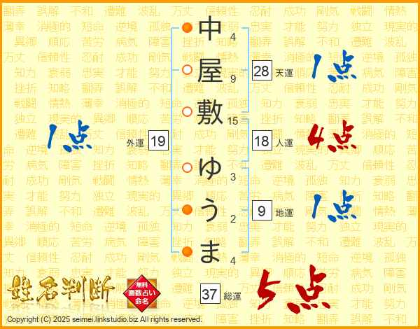 中(4画)屋(9画)敷(15画) ゆ(3画)う(2画)ま(4画)