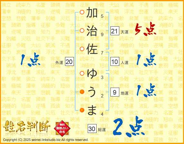 加(5画)治(9画)佐(7画) ゆ(3画)う(2画)ま(4画)