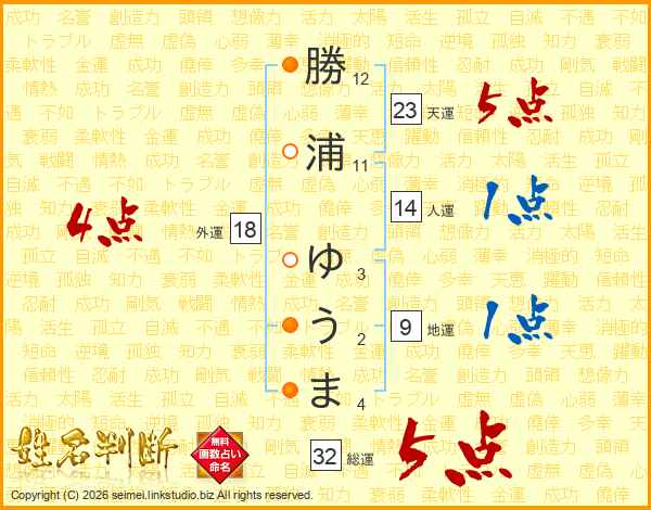 勝(12画)浦(11画) ゆ(3画)う(2画)ま(4画)